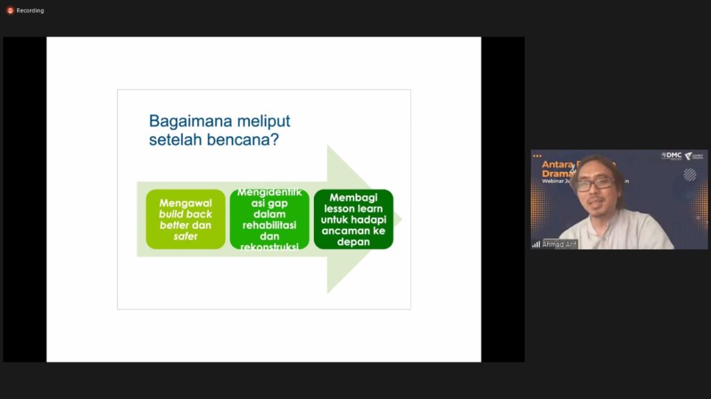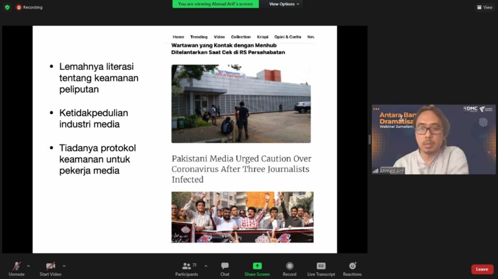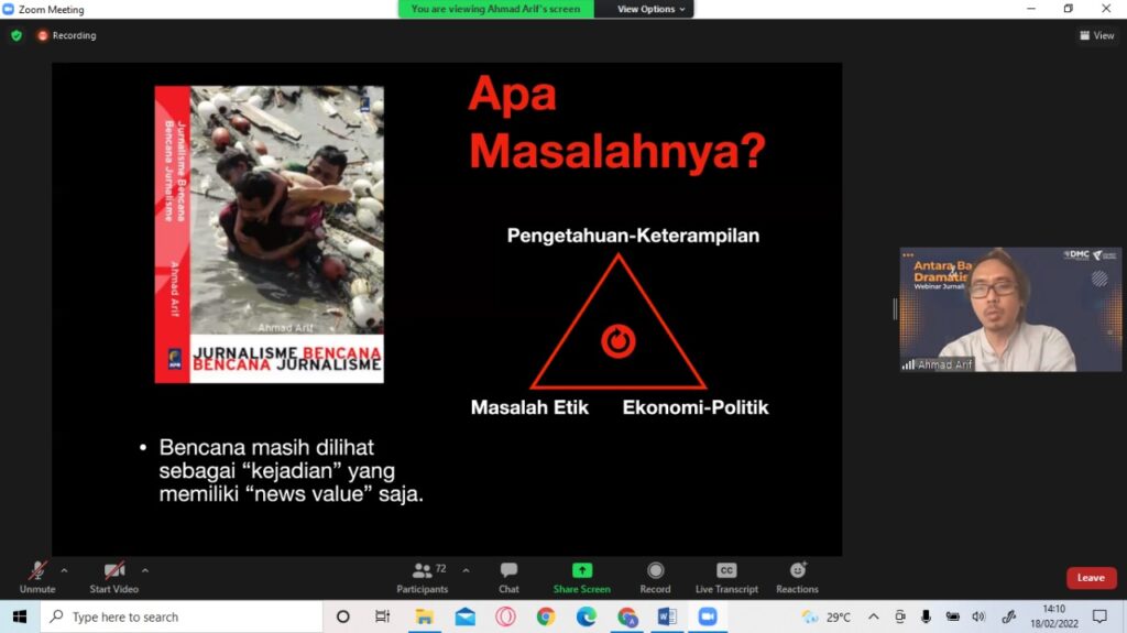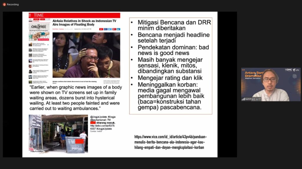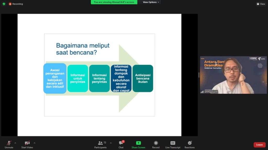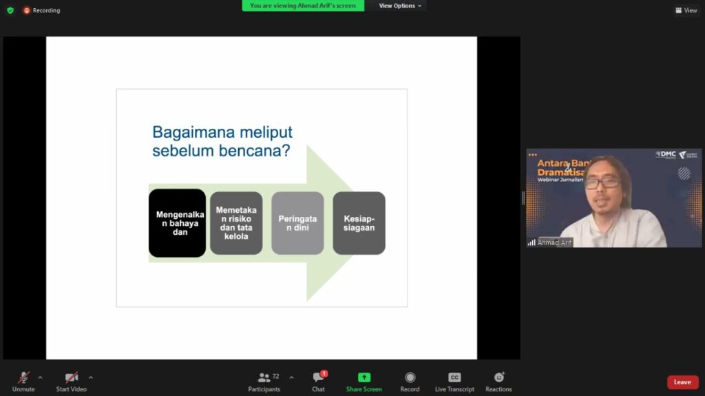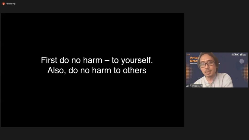 “First do no harm – to yourself. Also, do no harm to others,” ucap Ahmad Arif dalam paparan Webminar Jurnalisme Kebencanaan.