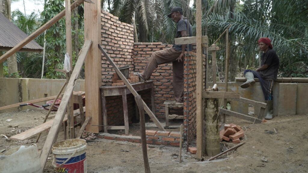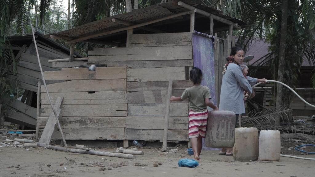 “Di sungai kami hanya mandi, cuci pakaian. Tidak untuk minum. Karena keruh juga. Untuk minum kami cari jauh di kebun sawit orang. Itulah di sana ada parit-parit kecil. Kami ambil air itu dua jerigen tapi kami endapkan dulu sebelum kami masak. Air itulah yang kami minum,” ucap Rohani.
